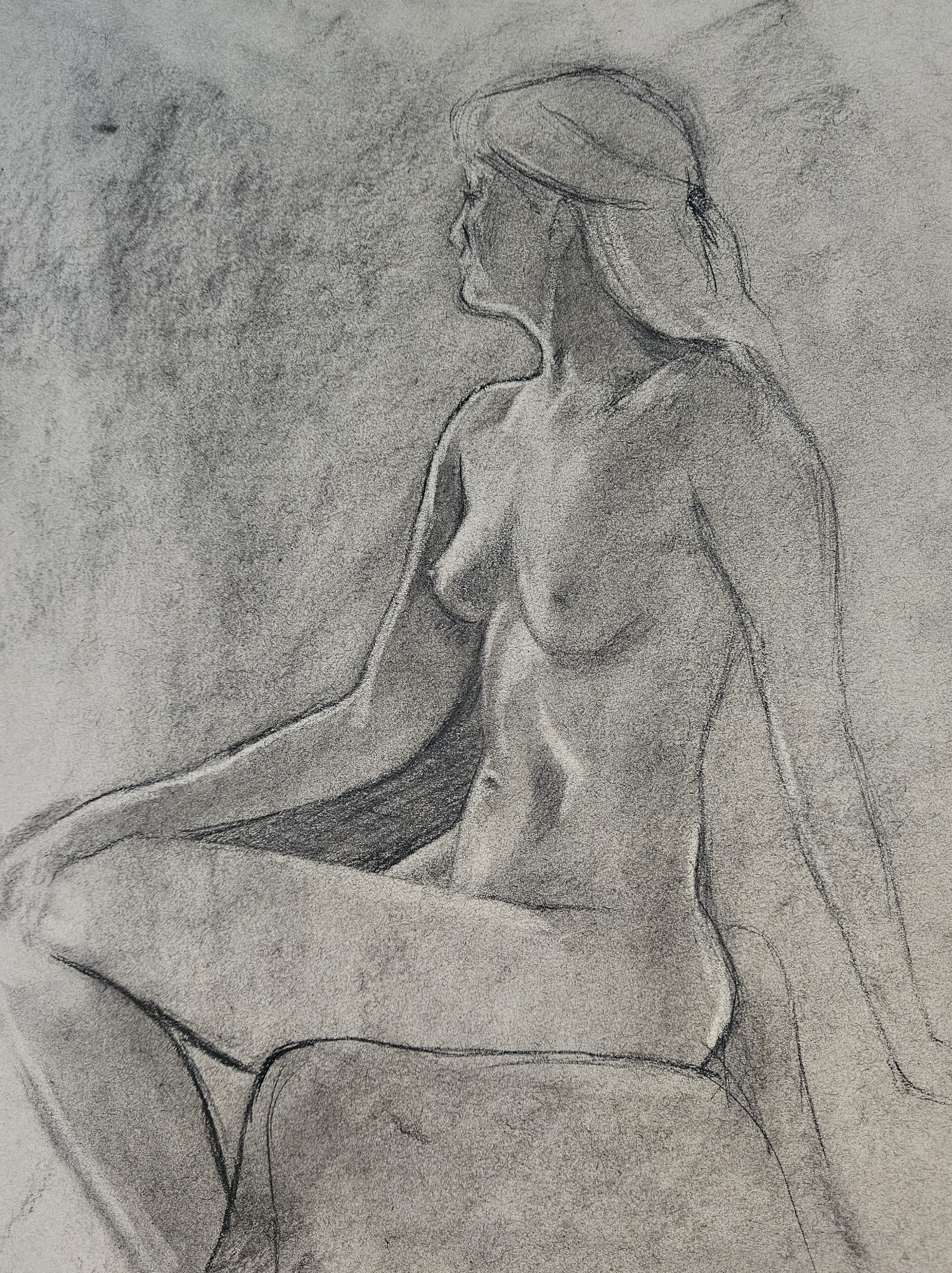 ‘Life Drawing female seated pose’ Charcoal on toned tan paper.
